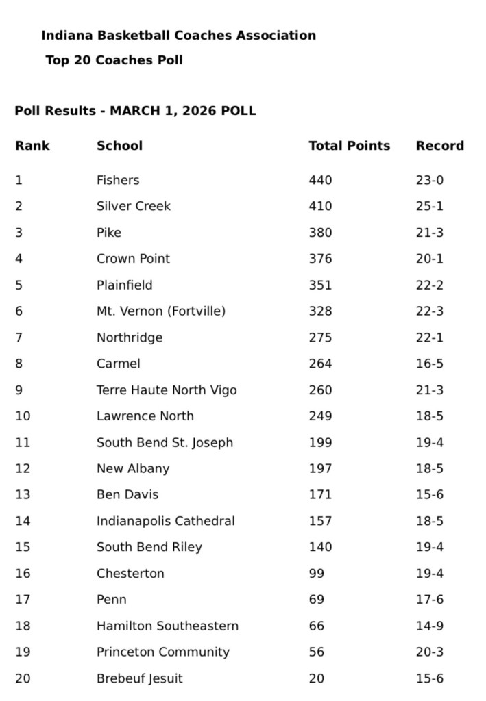 (3-1-26) Fishers (23-0) wrapped up this year’s IBCA Boys Basketball poll by picking up every 1st place vote.