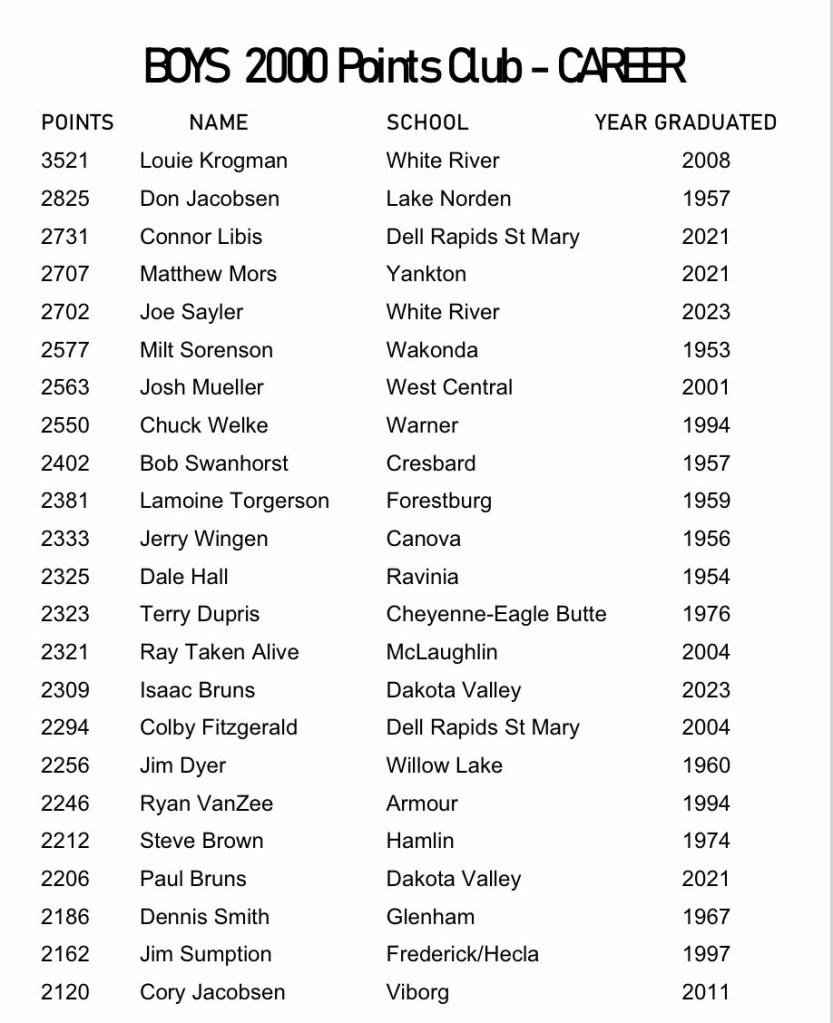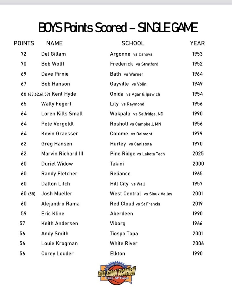 (3-4-26) 73 year old record broken…Pine Ridge senior Marvin Richard III scored a South Dakota single-game record 73 points in Pine Ridge’s 108-30 win over Lakota Tech in the Region 7A tournament. It broke the previous record of 72 points set by Argonne’s Delbert Gillam in 1953. Richard III hit 29 field goals, finished 12-of-12 at the free-throw line and nailed three 3-pointers.