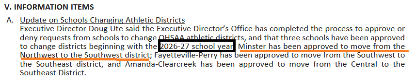 (3-5-26) — At the February 19th, 2026 OHSAA Board of Directors Meeting Minster was approved to change from the Northwest District to Southwest District starting next school year. It was approved after the Executive Director’s Office had completed the details of the move. Two other schools were also relocated.
