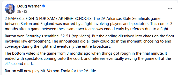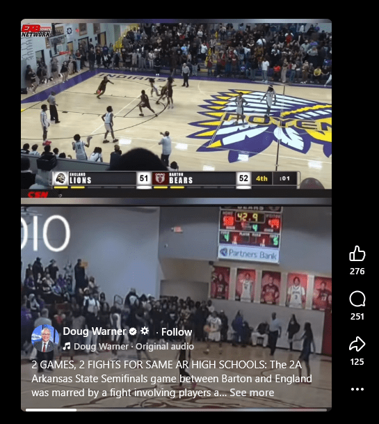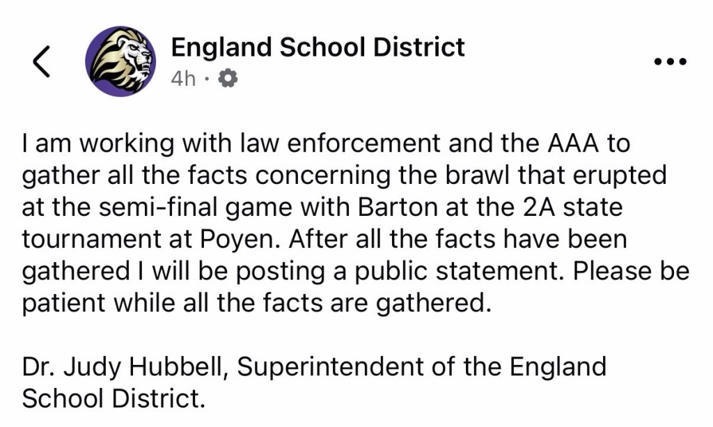 “The Arkansas Activities Association is currently investigating the altercation that occurred at the conclusion of the 2A Boys State Tournament contest between England and Barton High Schools.