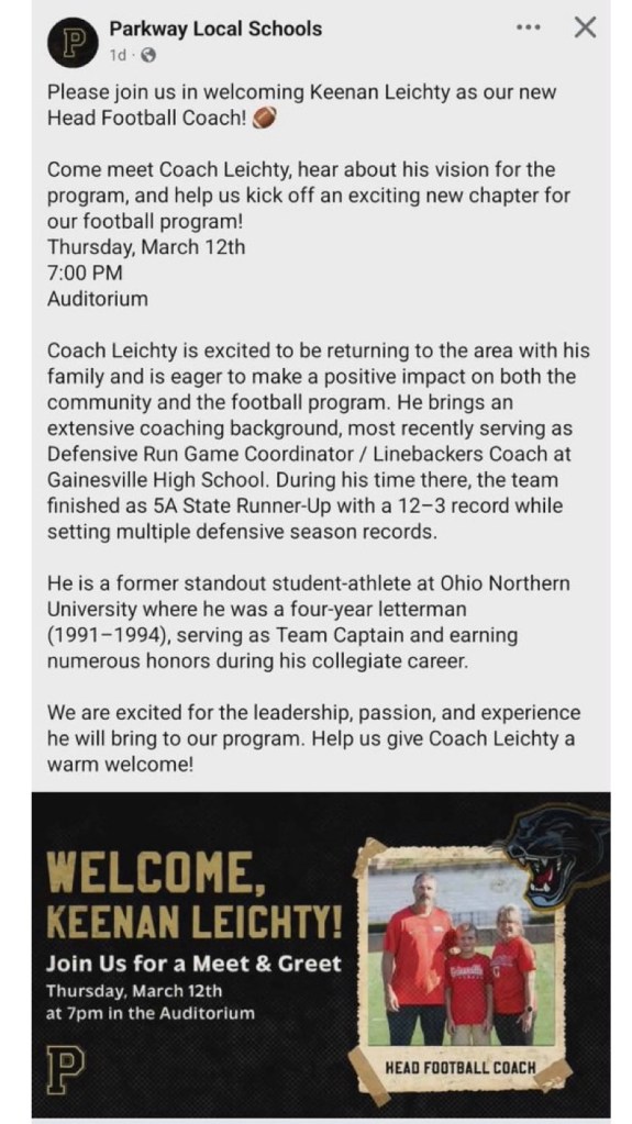 (3-8-26) Parkway announced today on social media that Keenan Leichty has been hired as the new head football coach.