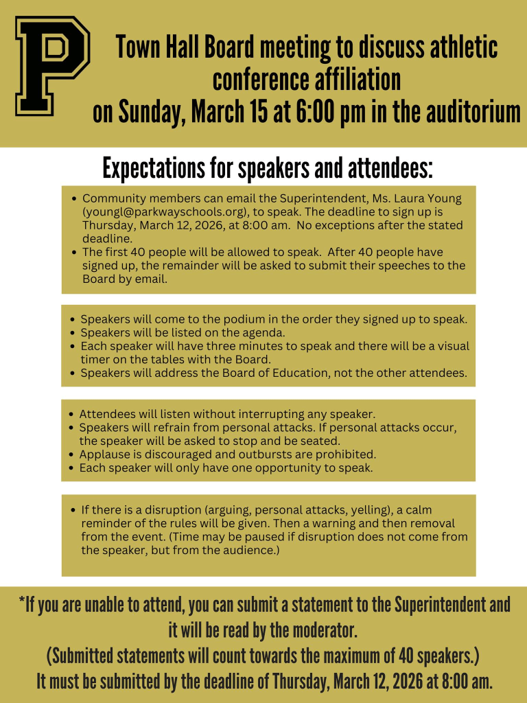 (3-9-26) This Sunday (March 11th) Parkway Schools residents will gather for a ‘town hall meeting‘ to discuss the Panthers future athletic conference home. An issue that has popped up in the past at Parkway.