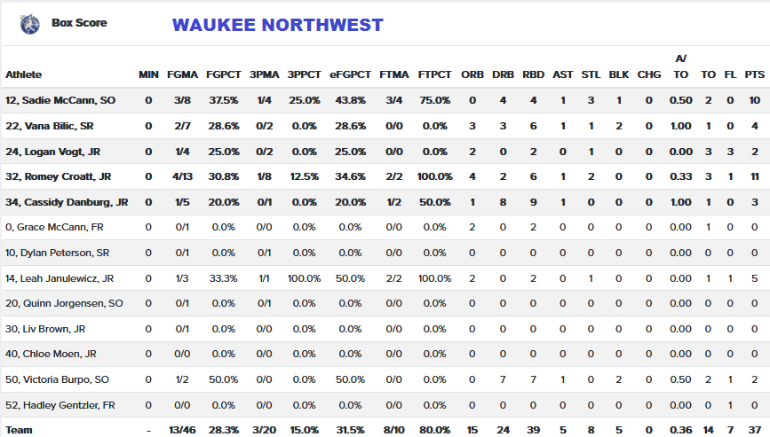 Northwest, which has been open only since 2021, got 11 points from Romey Croatt and 10 from Sadie McCann. The Wolverines never got into any kind of offensive rhythm, missing 10 of their 11 first-quarter shots and shooting just 27.7 percent for the game. Their 37 points were a season low.