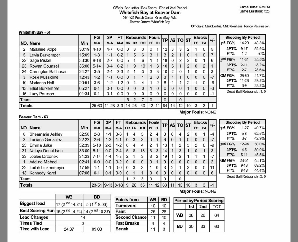 Game 3: #4 Beaver Dam (23-7), 63 vs. #2 Whitefish Bay (26-4), 64 – Boxscore