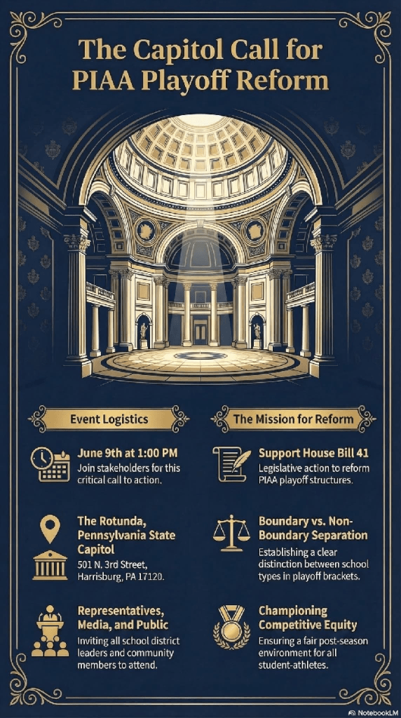 (3-23-26) On June 9th at 1pm a forum is scheduled to take place at the Rotunda, The Pennsylvania State Capitol and will focus on the public vs. private issue facing Pennsylvania Interscholastic Athletic Association (PIAA) member schools.