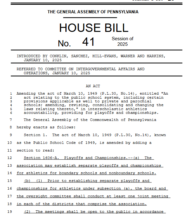 House Bill 41 (HB 41) in Pennsylvania is a 2025-2026 legislative proposal (sponsored by Rep. Scott Conklin, D-Centre County) that amends the Public School Code. It would allow—but not require—the Pennsylvania Interscholastic Athletic Association (PIAA) to establish separate playoffs and state championships for “boundary” schools (traditional public schools limited to district residents) and “non-boundary” schools (private, parochial, charter schools that can recruit more broadly).