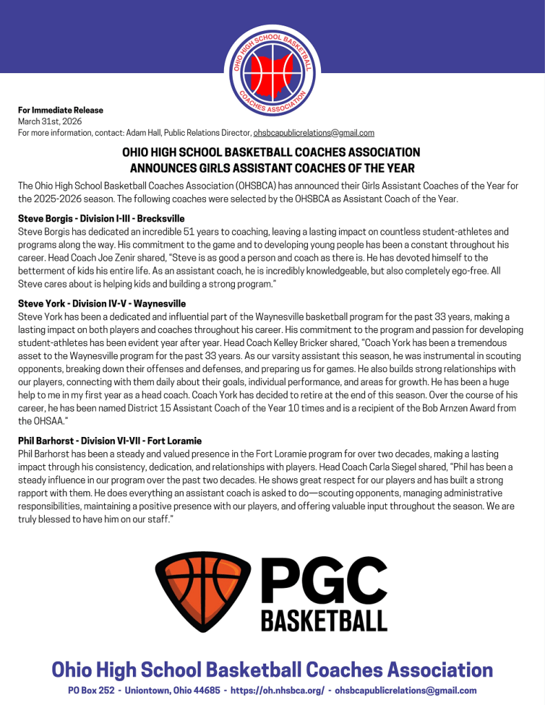 (3-31-26) The Ohio High School Basketball Coaches Association (OHSBCA) announced the 2025-26 Girls Assistant Coaches of the Year.