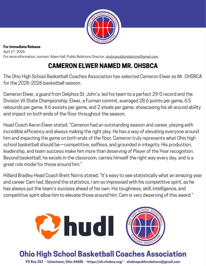boys basketball, ohio, Uncategorized Cameron Elwer Named 2026 Mr. OHSBCA Date: April 1, 2026Author: statelinesportsnetwork 0 Comments (4-1-26) Delphos St. John’s Cameron Elwer has been named the 2026 Mr. OHSBCA. Elwer was also named the D VII OHSBCA Player of the Year Share this: Share on X (Opens in new window) X Share on Facebook (Opens in new window) Facebook Like Loading...
