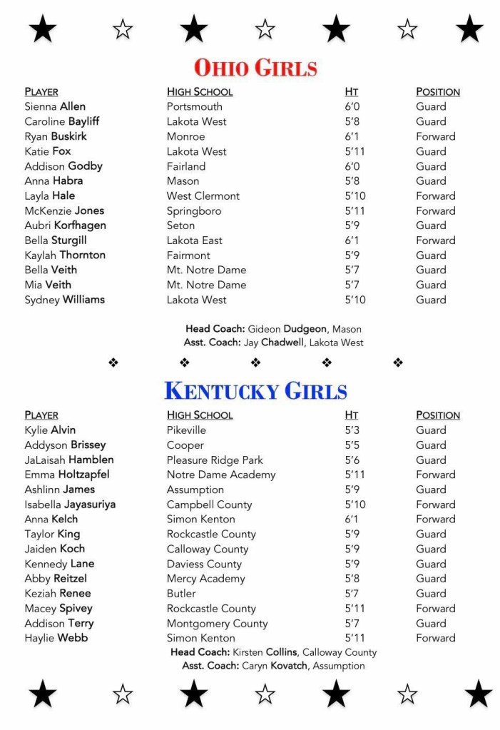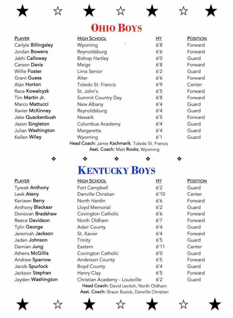 (4-3-26) The 33rd Annual Ohio-Kentucky All-Star Game (also known as “The Battle at the Border”) is a high school senior basketball showcase featuring top players from Ohio and Kentucky.