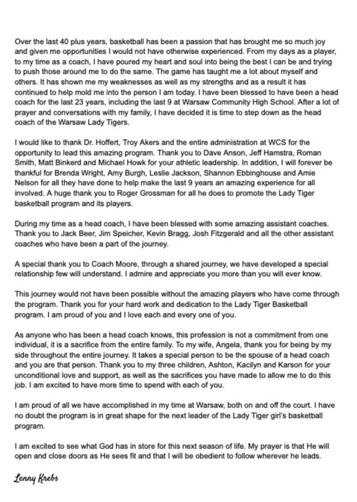 (4-15-26) Veterans Warsaw girls head basketball coach Lenny Krebbs announced today that he is stepping down.