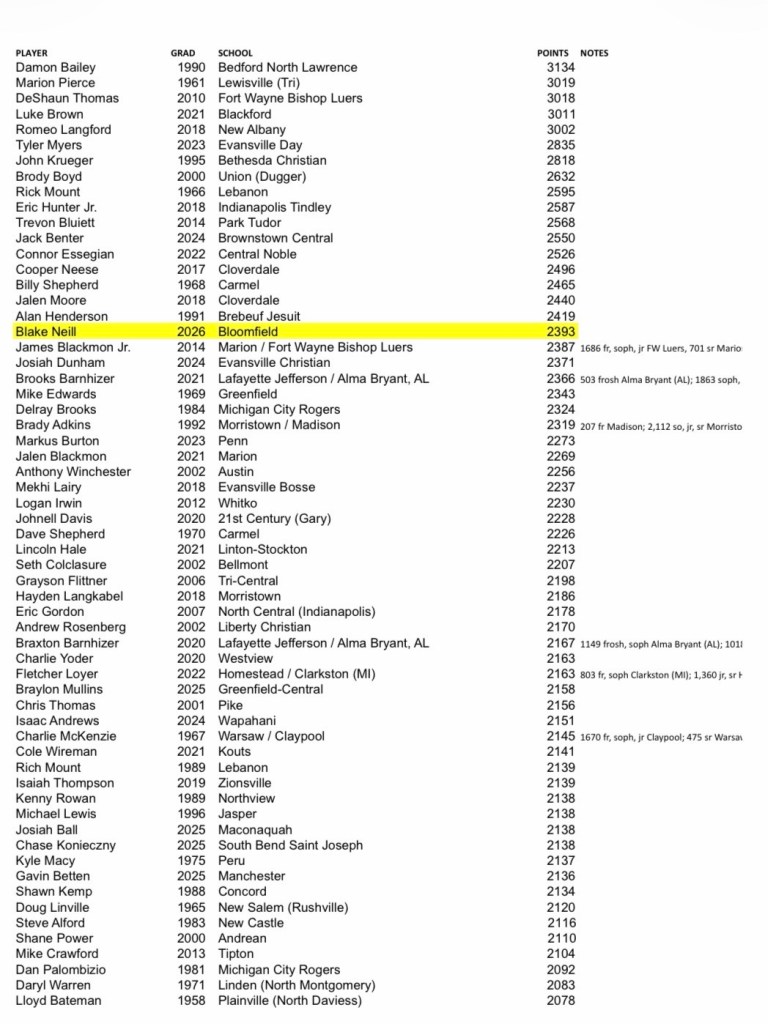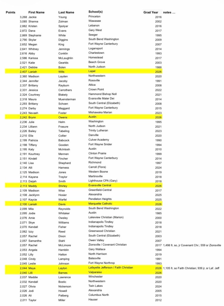 The boys’ leader is Damon Bailey, a 1990 graduate of Bedford North Lawrence, with 3,134 points. The girls’ leader is Jackie Young, a 2016 Princeton graduate, with 3,268 points.